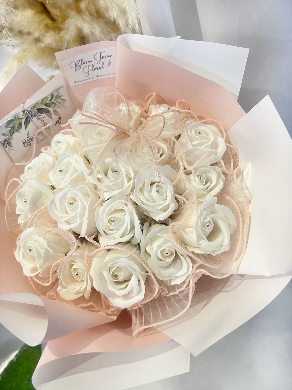 White colour soap roses with pink lace and white wrapping