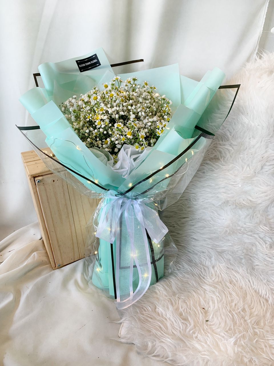 Chamomile mix Baby breath wrapping with tiffany blue paper and LED light